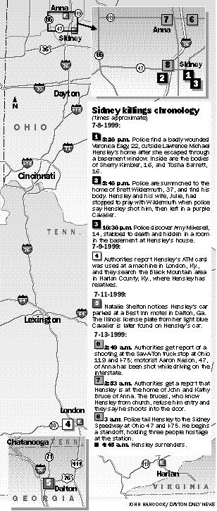 4 SHOT DEAD IN SIDNEY -- Gunman still on the loose; By Lisa Perry, Ben Sutherly and Mara Lee Dayton Daily News; Published: Friday, July 9, 1999 ; Page: 1A